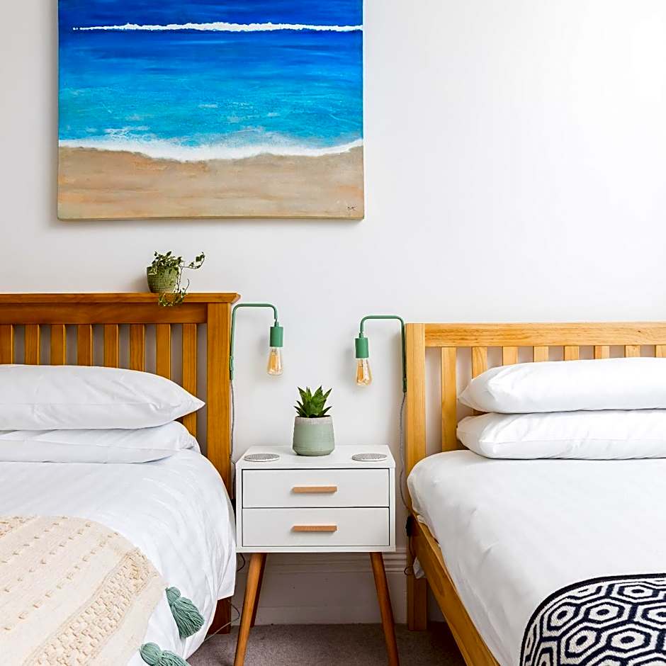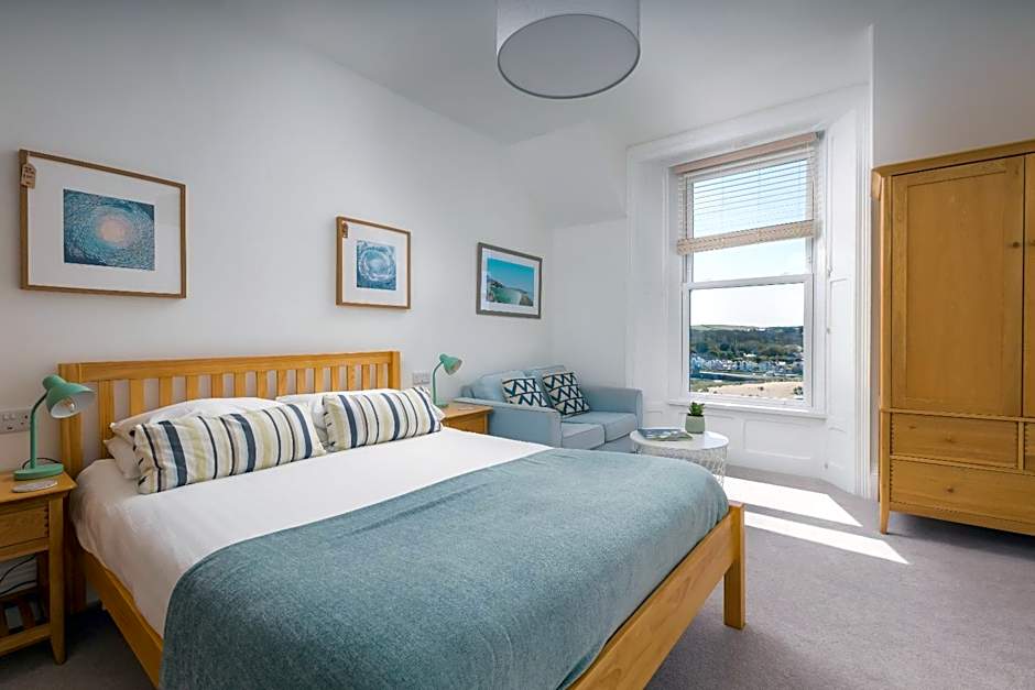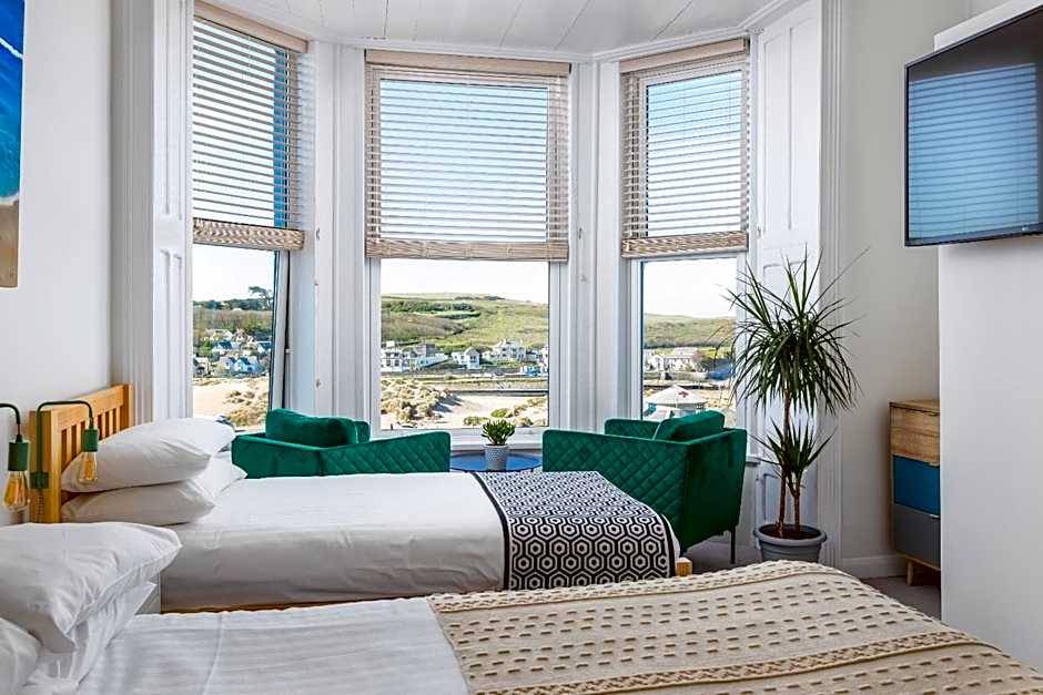 A first-floor large standard twin room with a double bed and a single bed and a Smart TV. The en-suite shower room has Cornish toiletries. Large bath sheets, hand towels and a hairdryer are also included.